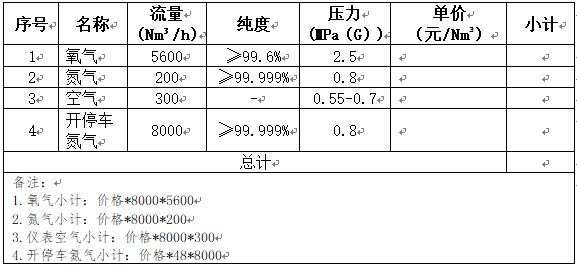 一、項目概述 1.項目規模:重慶市萬利來化工股份有限公司(以下簡稱“萬利來”)環保搬遷項目一期工程以天然氣為原料生產12萬噸/年甲醇,甲醇生產8.5萬噸/年二甲醚,副產3000萬Nm³/年高純氫氣。 2.供應地點:潼南區東B區需方項目廠區。 3.服務時間:自首次供氣日起 15 年(以下簡稱 “合同期”)。 二、項目內容 因萬利來搬遷項目需采購氧氣、儀表空氣和氮氣,擬采用競爭性磋商的方式邀請合格的供方參與報價,請供方仔細閱讀本文件的要求并提供合格的報價文件。 (一)基本要求 1.采購氧氣、氮氣、儀表空氣,不設保底量和基礎費用,根據需方實際耗氣量按月結算。 2.提供電價0.7元/kwh條件下的供氣報價(含稅)和調價機制,調價機制只與電價和PPI相關,調價機制合同期內不得變更,不通過補充協議等方式調整。 3.供方應在2027年6月前滿足氣體供應條件,接入點為需方指定的廠址紅線接口處,其所有費用由供方負責。 4.供方需在需方生產期間保質、保量、連續穩定供應氣體,供方應在供應協議文本中詳細表述和承諾,并提出保障措施。 (二)各氣體的主要技術要求 1.氧氣 流量:~5600Nm3/h(100%負荷),70%~110%負荷:4109~6160Nm3/h; 壓力:≥2.5MPa(要求壓力穩定); 純度:≥99.6%。 2.氮氣 正常生產時氮氣用量:~200Nm3/h;壓力:~0.8MPa(儲罐氮封~0.010MPa,用量約~100Nm3/h,離心式壓縮機的干氣密封壓力~0.8MPa,用量~80Nm3/h,電機開車時用量~60Nm3/h,~5分鐘,~0.5MPa);純度:O2≤10ppm; 開、停車時氮氣用量:~8000Nm3/h(每年約2~3次,每次約1~3天);壓力:試壓時~2.0MPa(短時間),置換、升溫時,~0.8MPa,純度:O2≤10ppm。 3.儀表空氣 流量:一期儀表空氣用量~300Nm3/h; 壓力:0.55≤P≤0.70MPa。 要求供應儀表空氣的管道為不銹鋼材質,并有應急措施保證持續穩定不間斷供應 其他要求:儀表空氣要求不含有腐蝕性和有毒氣體,除油、除水、除塵。凈化后的氣體中塵粒的直徑不得大于3µm,含塵量應小于1mg/m3,含油量不得大于1ppm。正常操作溫度:環境溫度;壓力露點:-40℃(常壓)。 以上壓力均表示供方送至需方界區內的壓力,且為表壓。 三、供方應具備下列條件 1.具有獨立承擔民事責任的能力。 2.近三年在經營活動中沒有違法記錄。 3.投標人及其法定代表人、主要負責人沒有犯罪記錄。 4.注冊資本:實繳不低于人民幣1000萬元(若以其他貨幣形式注冊的,按遞交響應文件截止時間當日匯率換算為人民幣)。 5.本項目不接受聯合體投標。 四、競爭性磋商文件的組成 (一)磋商文件包括本文件及所有發出的修改澄清通知,修改澄清與本文件不一致的,以最后發出的為準。 (二)供方應認真審閱磋商文件所有內容,如果供方不能實質性地響應磋商文件要求,則為無效報價文件。 (三)供方在收到磋商文件后,若有疑問需要澄清,應于收到磋商文件后2日內以書面形式(包括書面文字、傳真、電子郵件等)向需方提出,需方將以書面形式2日內予以解答,解答內容將送達所有參與競爭性磋商的供方。 五、響應性文件的組成 響應性文件應采用A4規格紙編制并裝訂成冊,需加蓋單位公章及法定代表人或授權代表簽字。并提供U盤電子版。必須包含以下幾個部分內容: (一)法定代表人身份證明或授權委托書 (二)營業執照及其他相關資質證書。 (三)空分裝置方案:包括裝置規模、投資金額、建設周期計劃表、核心設備參數等。 (四)異常情況下的保供設施、措施、方案。 (五)確保長期穩定供應氣體的保證措施。 (六)提供供氣協議文本。 (七)履約擔保措施。 (八)所供氣體的價格(含稅)(報價基礎電價0.7元/Kwh含稅)。